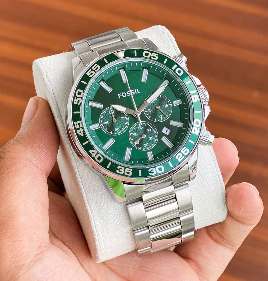This 45 mm Bronson features a green satin dial, chronograph movement and full silver metal strap. ?